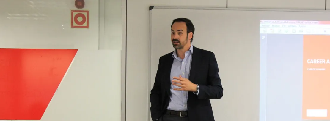 Carlos cierra la primera entrega de los talleres de empleabilidad organizados por el Departamento de Carreras Profesionales de EAE. “Voy a contaros las reglas del juego, el entorno que tenéis ahí fuera para que cuando os enfrentéis con el mercado laboral lo hagáis bien” explica a los estudiantes de EAE: “si salís al mercado preparados os va a ir bastante mejor” aclara.