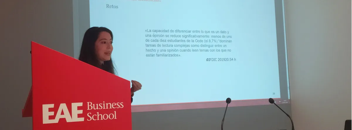 “Los datos han sido siempre el petróleo de las organizaciones”, expresó Cristina Gallego, consultora de Experiencia de Usuario y Business Analyst, la importancia del análisis y la visualización de datos durante su ponencia “De la Analítica de Datos al Business Intelligence” en el campus de Madrid de EAE Business School el pasado 27 de enero. Durante el evento, Gallego destacó la necesidad de contar con un perfil profesional orientado a contextualizar los datos en una sociedad cada vez más informada.