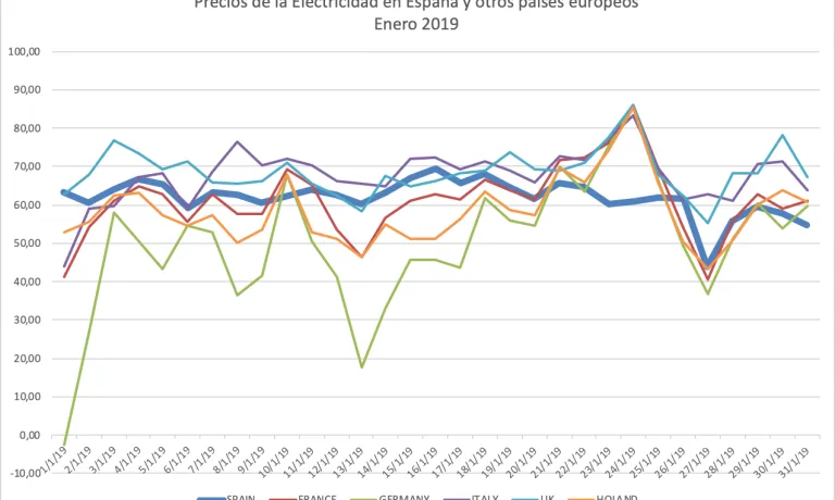 En términos comparativos, el precio de la electricidad se alinea con el producido en otros países europeos continuando con la tendencia al acoplamiento de los mercados, que es objetivo europeo, así a 31 de enero el precio en Alemania, Francia y UK se situaría en 59, 61 y 71 , respectivamente, con un promedio de precios de 61, 60 y 65 . Hay que destacar la menor volatilidad del precio español.