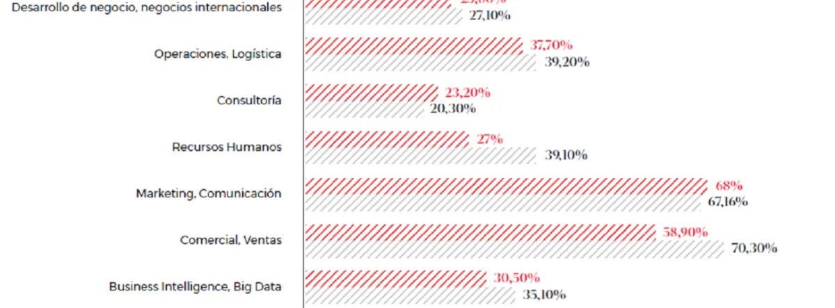 Los perfiles más demandados en el entorno laboral actual son el de Marketing y Comunicación (68%), Comercial y Ventas (58,90%) y, también, Finanzas y Administración (54,10%). Además, las perspectivas advierten de un aumento significativo en las posiciones relacionadas con gestión de proyectos, especialmente en lo relativo a la adaptación al escenario tecnológico actual (Big Data, redes sociales e Inteligencia Artificial) en una economía global, sostenible y circular.