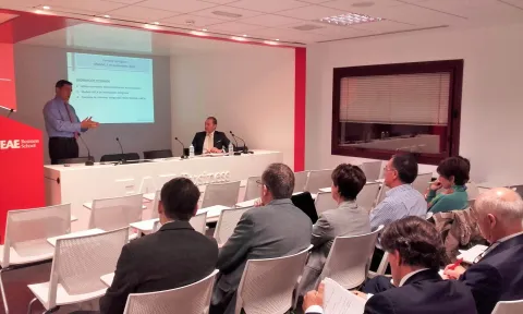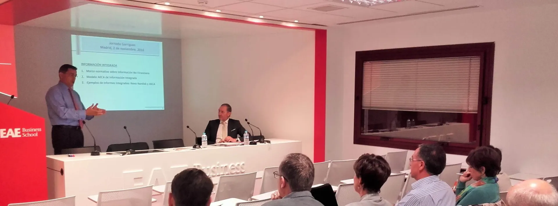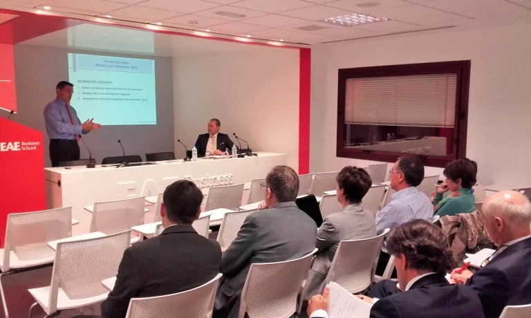 El Campus de Madrid de EAE Business School ha acogido, el pasado jueves 3 de noviembre, la ponencia por parte de José Luis Lizcano, Director General de la Asociación Española de Contabilidad y Administración de Empresas (AECA) y Coordinador de la Comisión RSC Proyecto Integrated Reporting Suite. Este ha sido además el primer evento celebrado en EAE Business School con AECA, empresa colaboradora de la Escuela. En la exposición, el invitado también ha dado a presentar la plataforma Integrated Suite, una solución para compañías, gobiernos, inversores, académicos y público general, con el fin de mejorar el reporte financiero y no financiero. La conferencia completa ya está disponible en el canal de AECATV.