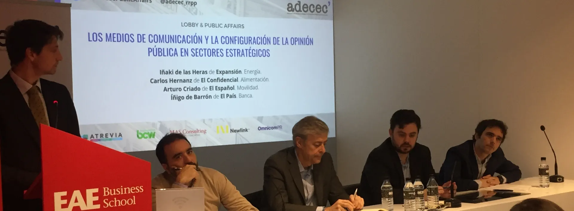La mesa de discusión, organizada entre otras empresas, por ADECEC, Atrevia y BCW, fue dirigida por 4 periodistas que representaron a su vez distintos sectores estratégicos de la comunicación. Ellos fueron: Iñaki de las Heras del diario Expansión (Energía), Carlos Hernanz del diario El Confidencial (Alimentación), Arturo Criado de El Español (Movilidad) e Íñigo de Barrón de El País (Banca). De 9 a 11, acompañados por estudiantes y empresarios, los ponentes crearon un espacio de diálogo que tenía como objetivo principal aprovechar las oportunidades que se están presentando en el sector de la comunicación y así fomentar una relación de confianza entre medios-empresa-usuario.