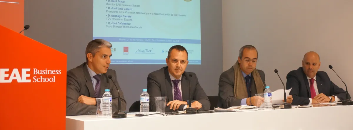 En la conferencia también participó José Díaz Canseco, profesor del Executive MBA, MBA y Máster en Dirección de Recursos Humanos en EAE Business School, socio director de TheHumanTouch y miembro de la junta directiva de ARHOE, como consultor reconocido por la Asociación. "¿Realmente trabajáis en una compañía con unos horarios racionales?", preguntaba a los alumnos presentes en la sesión. Los datos indican que el 84% de los trabajadores responde con una afirmación a la cuestión, aunque solo un 6% se considera satisfecho de cómo trabaja en ello su empresa. "Hay que cambiar el foco en las organizaciones, donde a veces pecamos de diseñar y tomar decisiones que no se llevan a la práctica".