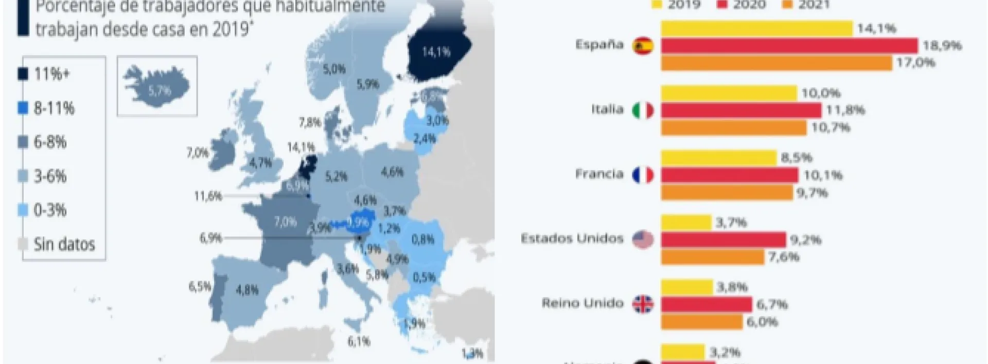 La implantación del teletrabajo en España no se produce en la mayoría de los casos por no disponer de la tecnología adecuada, pues tenemos una de las mejores fibras ópticas de Europa aunque no llegue en muchas ocasiones a los municipios vaciados, sino por la dependencia del PIB y del empleo de sectores como el turismo y la construcción que necesitan estar presentes, tanto los clientes como los empleados. Y esto impacta de lleno en la tasa de desempleo.