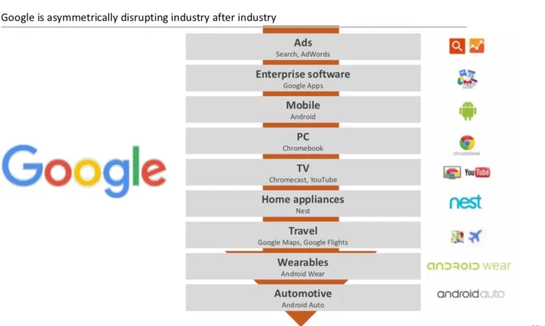 Asymmetrical business models are based on transferring value between industries. For instance, Amazon has generated value through a product like Kindle, the monetization of its App Store and the ecommerce sales generated. Google has generated value with its smart devices, the Google Play platform and Wallet. In fact, Google has asymmetrically disrupted one industry after another: advertising with Search and AdWords, business software with Google Apps, mobile phones with Android, PCs with Chromebook, television with Chromecast and YouTube, electrical appliances with Nest, travel with Google Maps and Flights, wearable technology with the Android Wear system and transport with Android Auto.